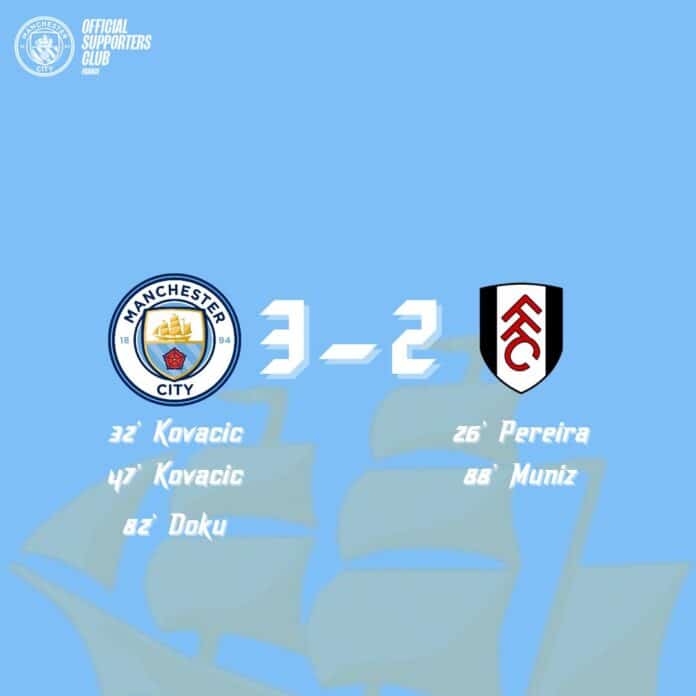 Manchester City vs Fulham Par Paul (@AlsatianCityzn) - 5 octobre 2024 0 518 FacebookTwitterPinterestWhatsApp vs Fulham Vidéo Détails Date Temps Ligue Saison 5 octobre 2024 16h00 Premier League 2024-25 Lieu Etihad Stadium 9 Ashton New Rd, Manchester M11 3HY, Royaume-Uni RésultatsÉquipe1st Half2nd HalfGoalsRésultat123VictoireFulham112Défaite 31Ederson Moraes Gardien 93'82Rico Lewis Défenseur 25Manuel Akanji 2 Défenseur3Ruben Dias Défenseur24Joško Gvardiol Défenseur8Mateo Kovačić Milieu 32', 47'20Bernardo Silva Milieu 95'19Ilkay Gündogan 27 Milieu47Phil Foden 5 Milieu10Jack Grealish 11 Milieu9Erling Haaland Attaquant18Stefan Ortega Gardien33Scott Carson Gardien5John Stones 47 Défenseur2Kyle Walker 25 Défenseur27Matheus Nunes 19 Milieu87James McAtee Milieu26Savinho Attaquant11Jérémy Doku 10 Attaquant 82'