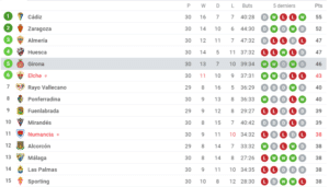 Au classement, Girona conservent leur 5e place qu’ils préserveront au terme de cette 30ème journée. 13 victoires, 7 matchs nuls et 10 défaites au compteur pour les catalans pour le moment.