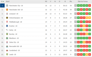 City est donc leader de cette Premier League North U18 au goal-average, avec 2 matchs de retard et à égalité de points avec le rival United: