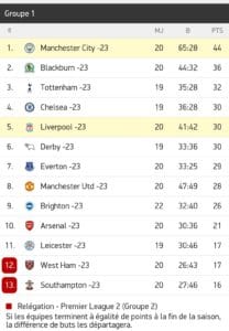 Au classement donc, City est premier avec 8 points d’avance sur le second, Blackburn, puisque évidemment, les Rovers se sont inclinés à Everton (2-1) ! Bravo aux Toffees !