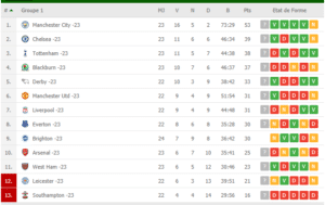 Au classement City atteint donc 53 points, un record en Premier League 2, avec 16 victoires en 23 rencontres, pour 5 nuls et seulement 2 défaites, en étant officiellement invaincu à domicile de toute la saison :