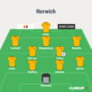 On imagine un 4-2-3-1, composition maîtrisée par Norwich. Cela leur permet d’avoir un milieu solide et de se projeter en contre. Néanmoins on relèvera l’absence de nombreux joueurs.