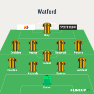 On imagine un 4-1-4-1, composition récemment mise en place depuis le retour de Quique Sanches Flores. Cette formation est également due à l’absence de Troy Deeney.